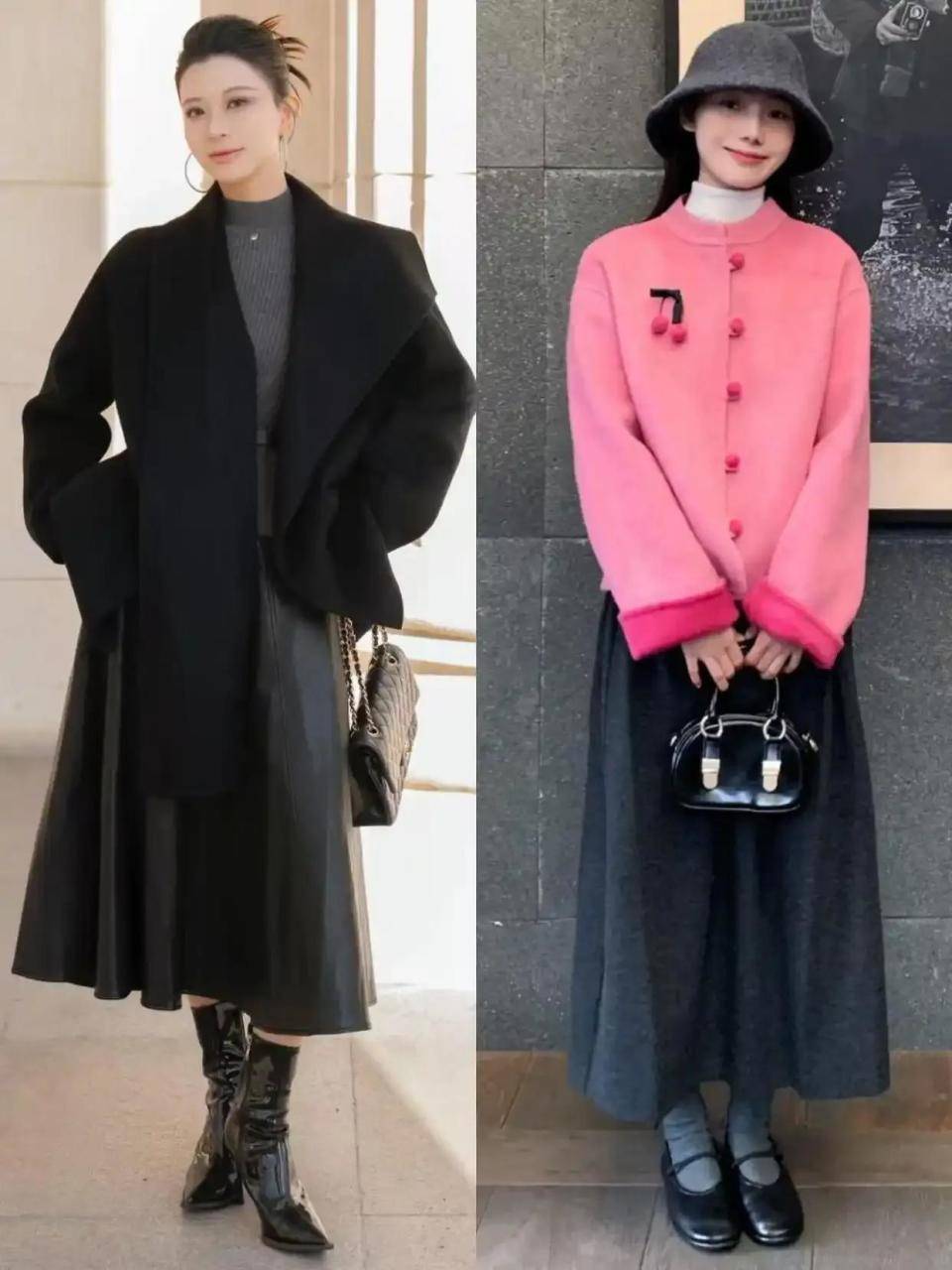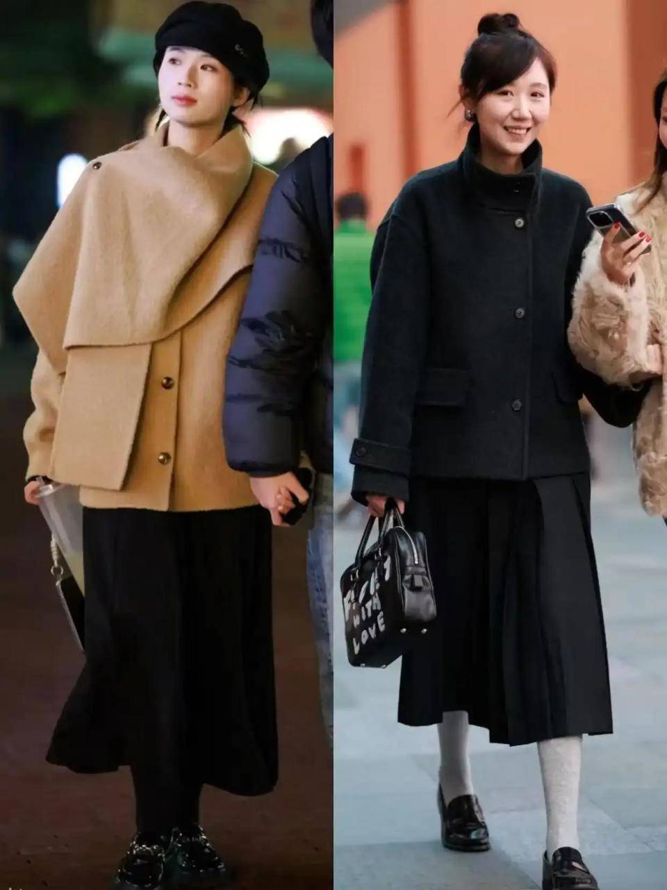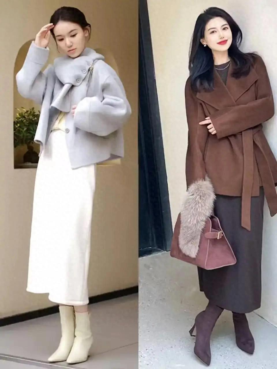 短大衣利落收束,直筒裙温婉垂坠,再配上一双利落的短靴。 这般上短下长的巧思,将“小姨风”的优雅与大气拿捏得恰到好处。 既有成熟女性的从容,又不失时髦的韵味,行走间,便是一道最迷人的风景。