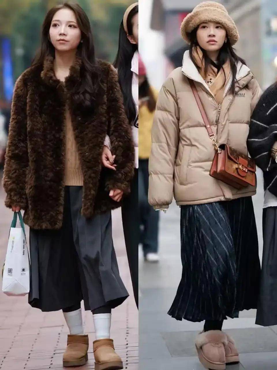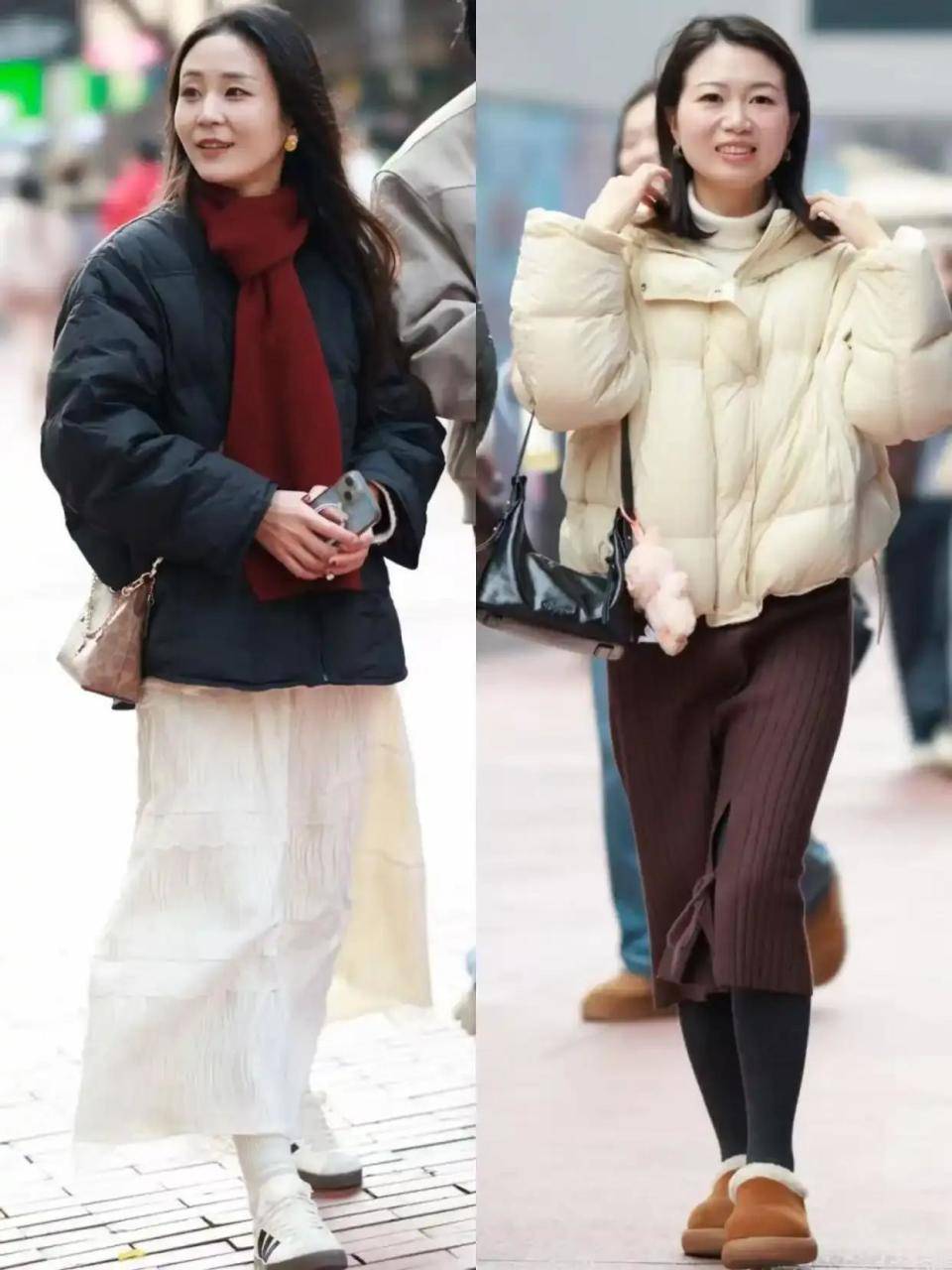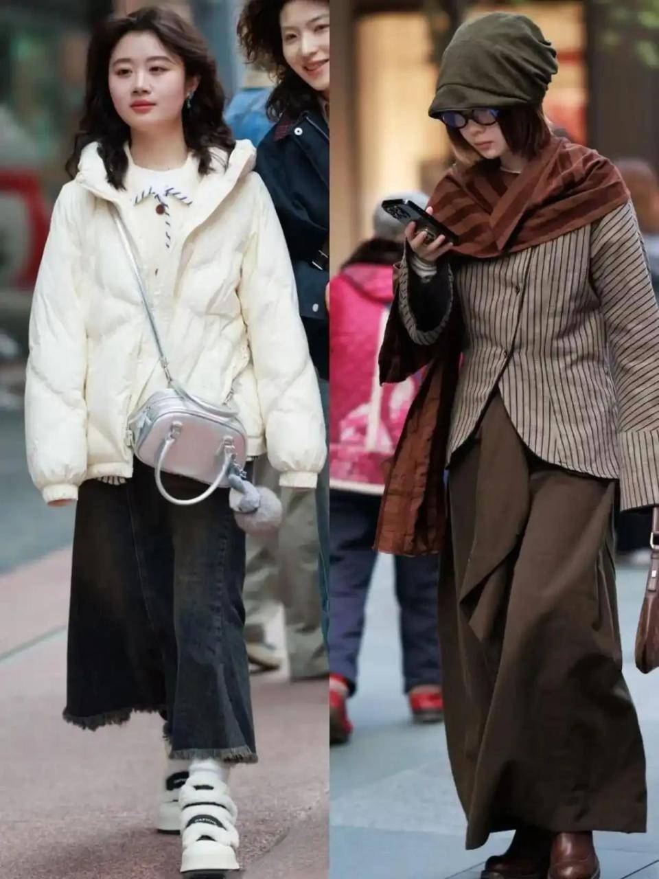 一身白羽绒搭配牛仔裙,脚踏小白鞋,是扑面而来的甜美与活力;或是换上质感满满的棕色短靴,配一袭咖色裙与条纹衫,围巾轻拢,瞬间拉满复古拉风的气场。